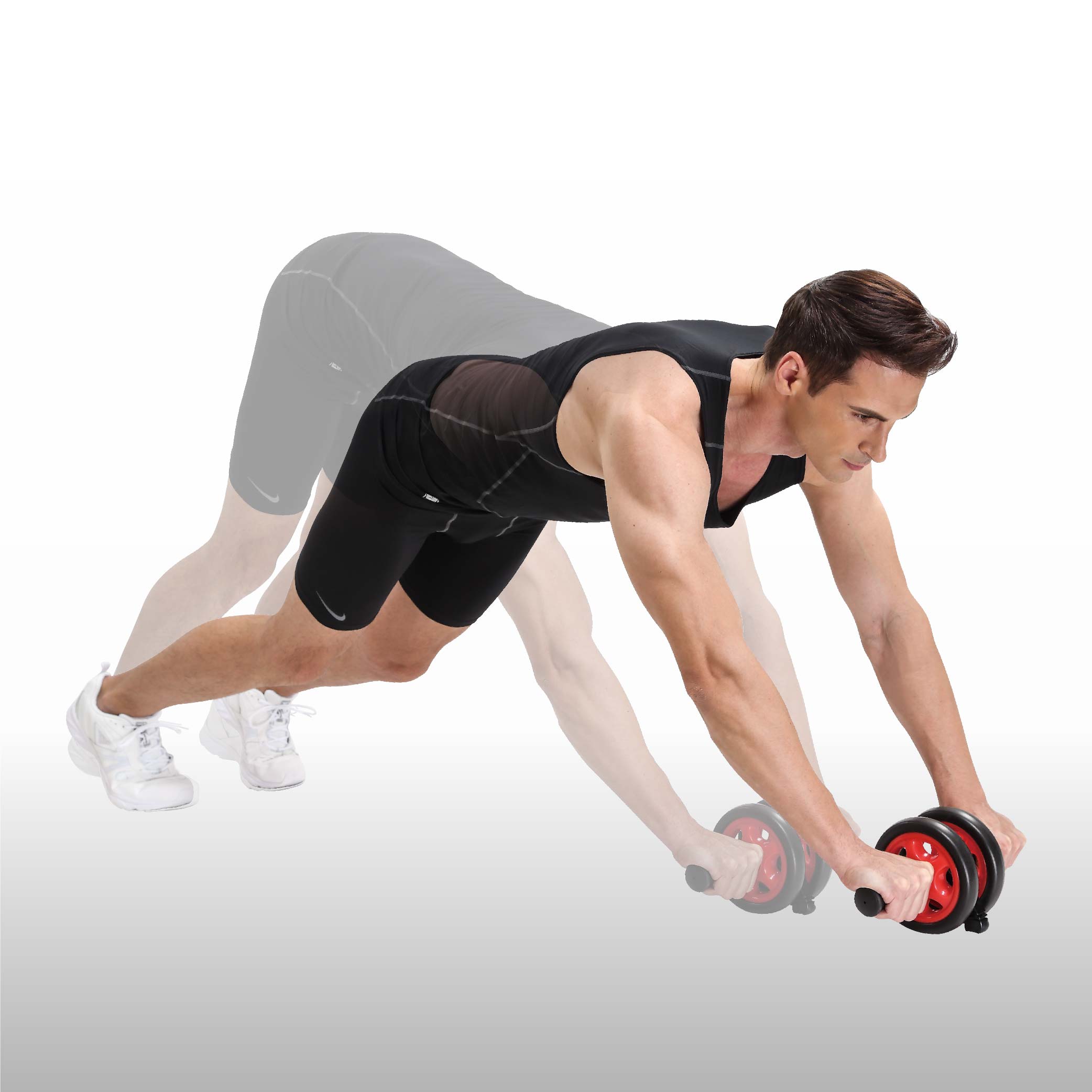Kneel on the soft surface, hold the bodybuilding wheel handles with both hands, stretch both hands forward, and use the bodybuilding wheels to workout the whole body safety and relaxed .